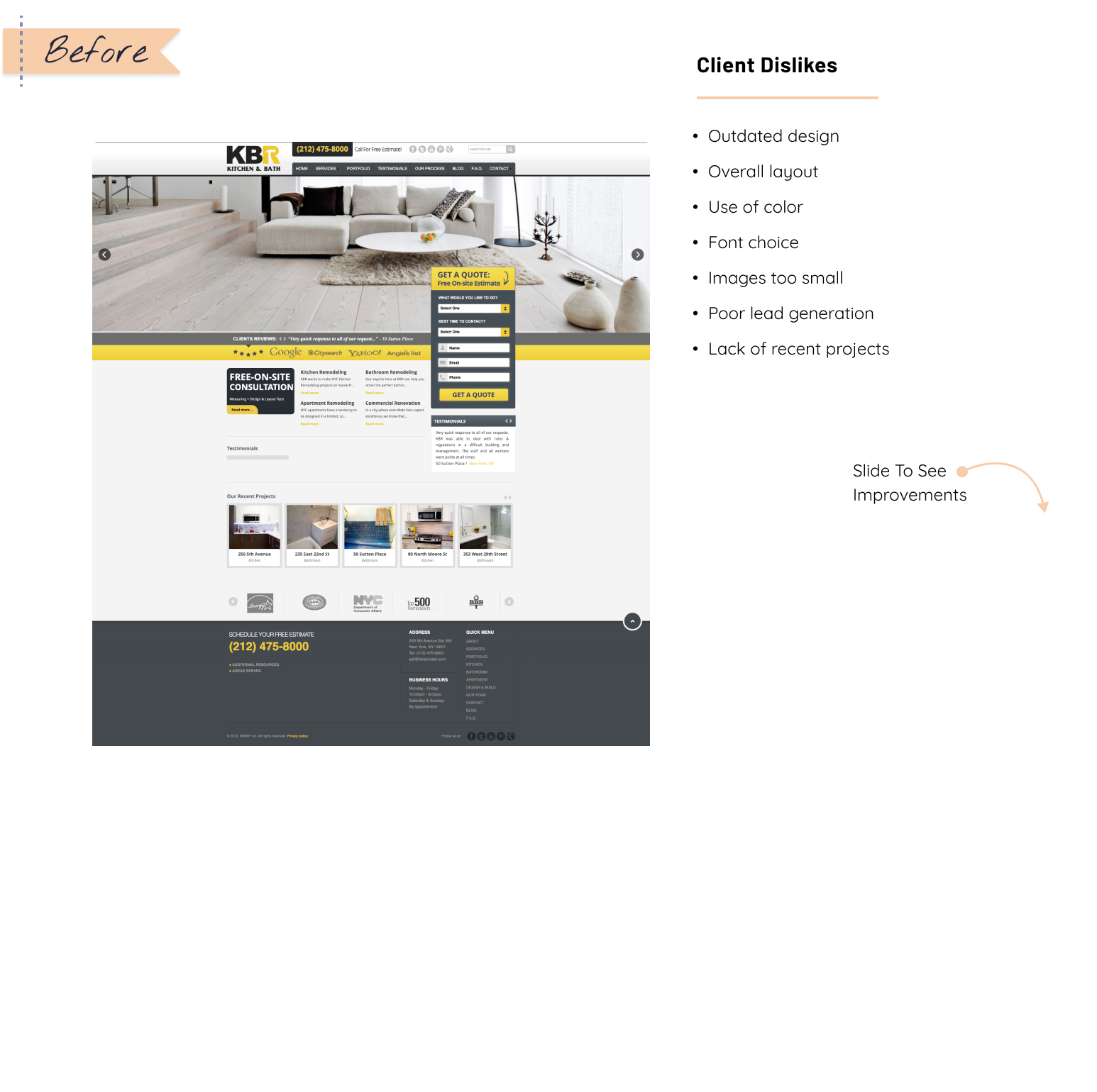KBR, a high-end residential design-build firm serving the New York area, approached us after a disappointing website redesign experience. Their existing site did not meet expectations in terms of visual design, layout, or lead generation. As a firm known for its refined, word-of-mouth reputation among luxury homeowners, they needed a digital presence that matched the sophistication of their work.